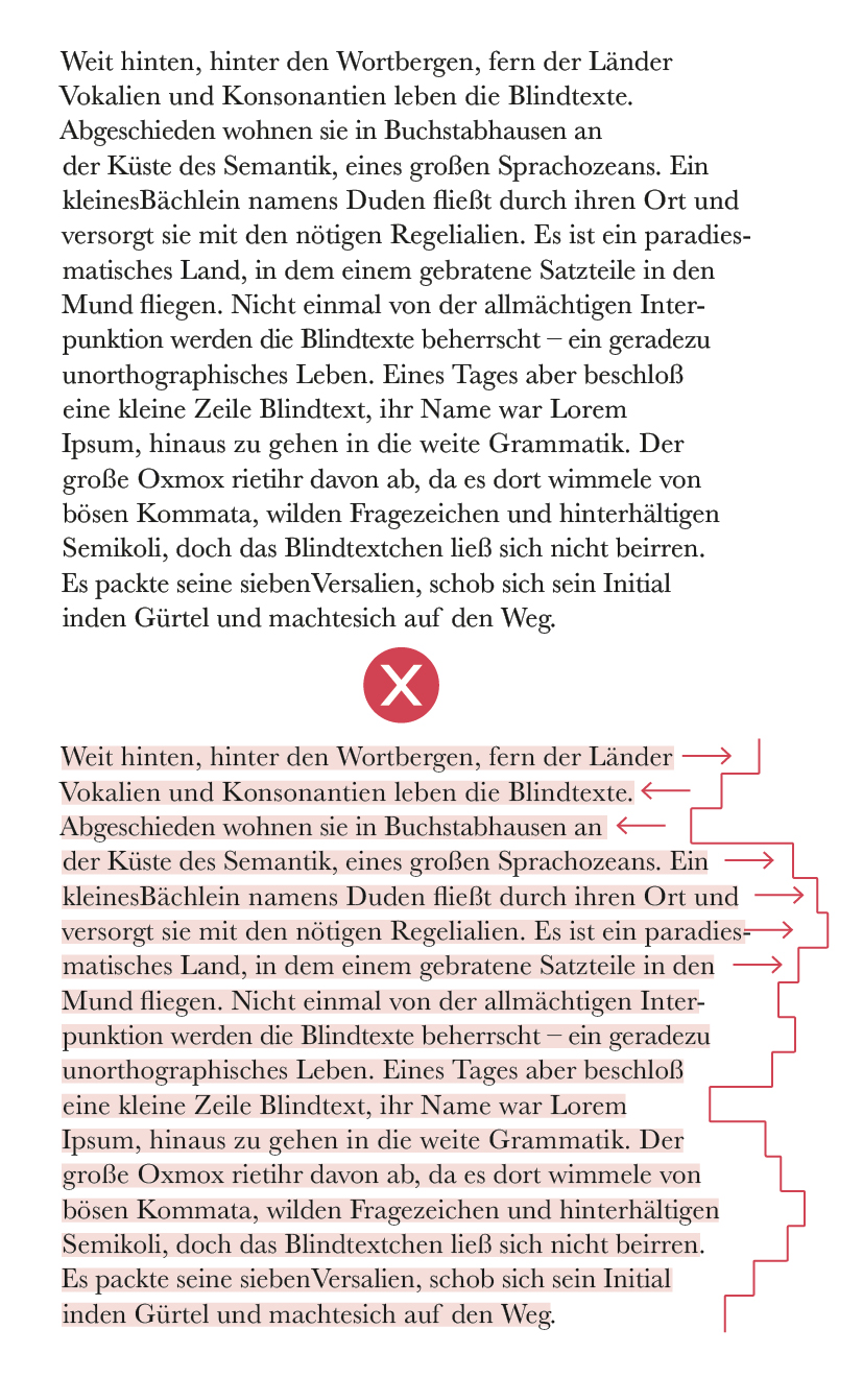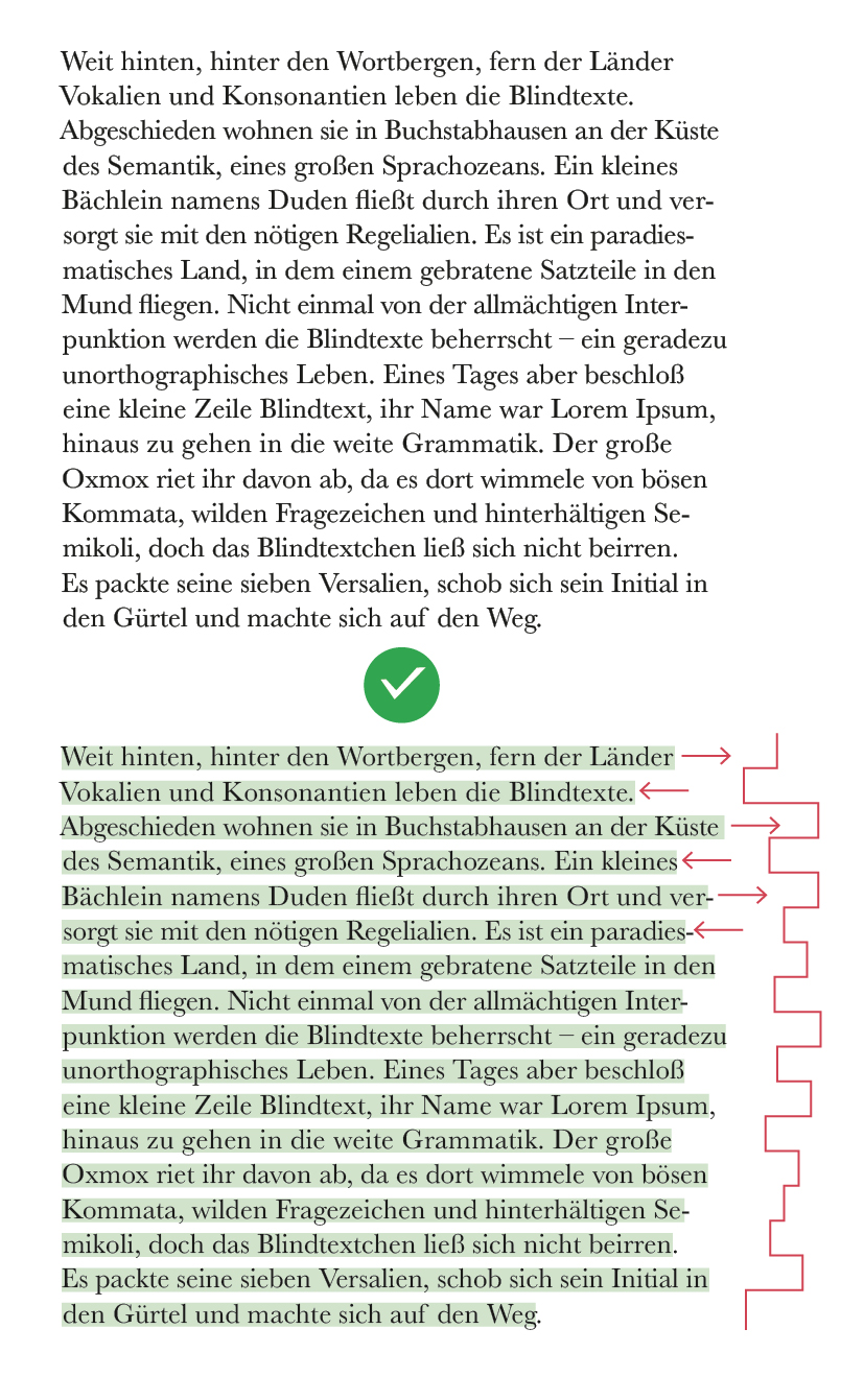 Bei einem unprofessionell und schlecht gesetzten Flattersatz gibt es Bäuche oder Kerben über mehrere Zeilen hinweg. Das Schriftbild sieht unharmonisch aus.