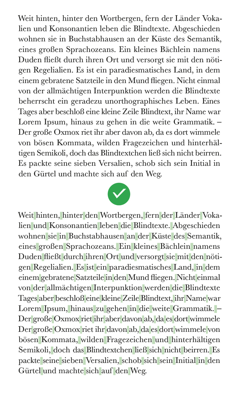 Bei einem typografisch gut gesetzten Blocksatz sind die Wortabstände weitestgehend gleichmäßig. Das führt zu einem ausgewogenen, ästhetischen Satzbild und einer guten Lesbarkeit.