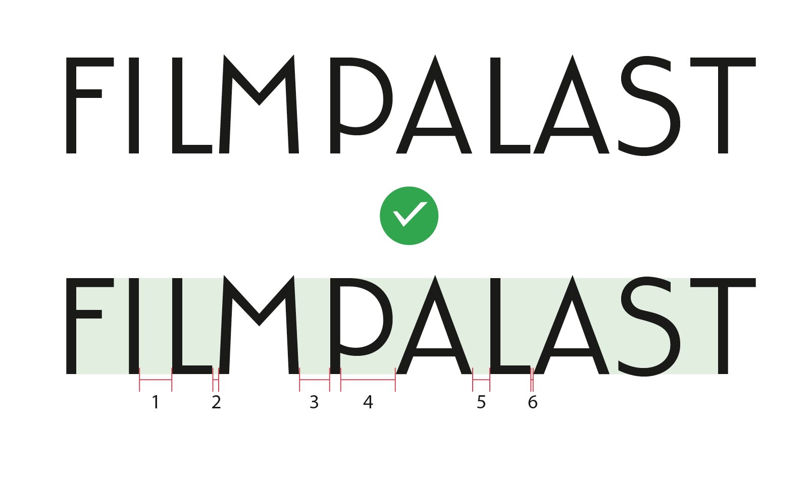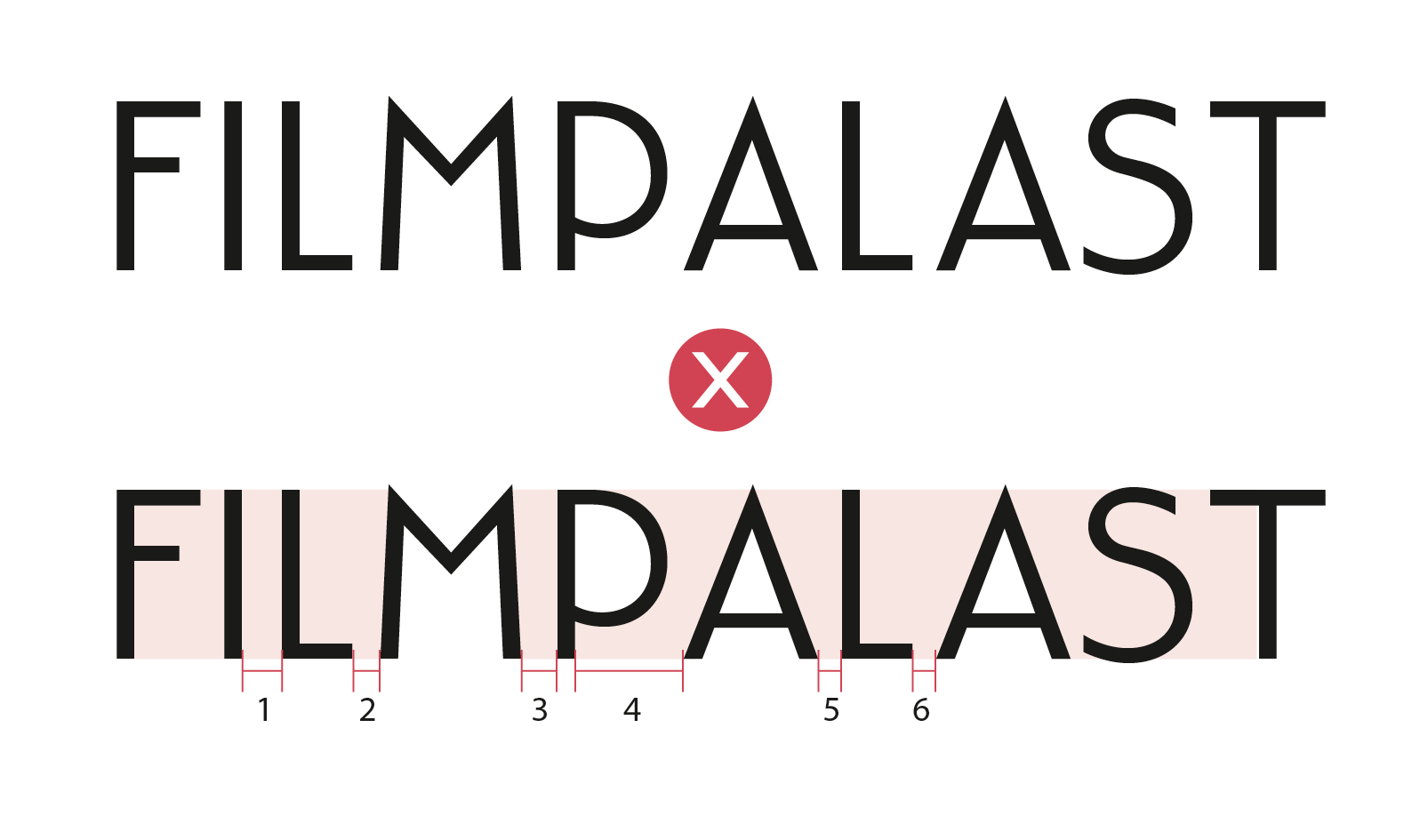 Auf der anderen Seite Kombinationen wie »MP« (3), die einen kleinen Zwischenraum aufweisen. Beim Ausspationieren wird der Buchstabenabstand zwischen »MP« in dem Beispiel manuell vergrößert und der Abstand zischen LA verkleinert.
