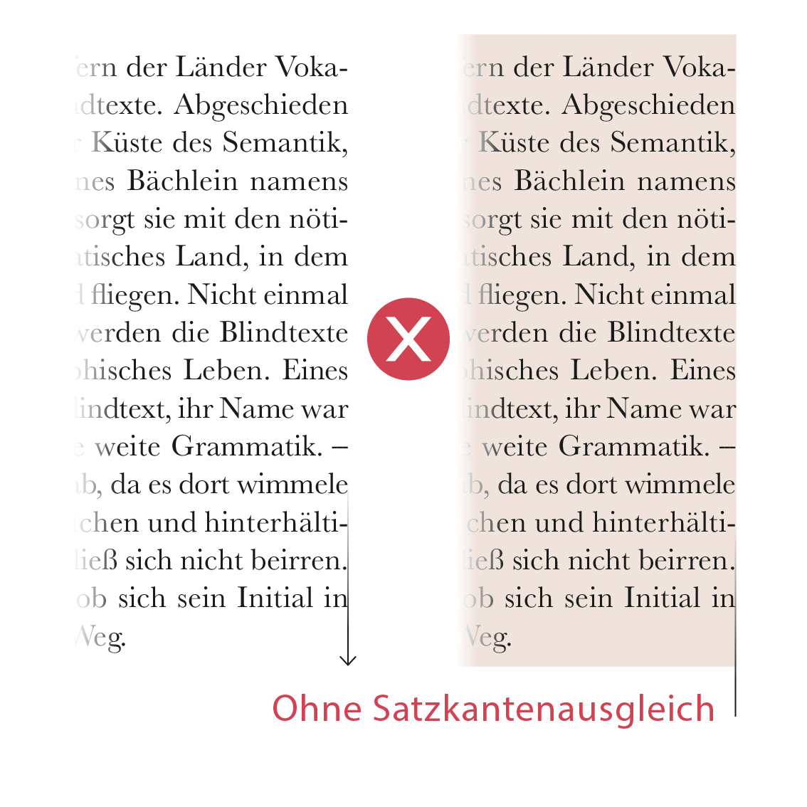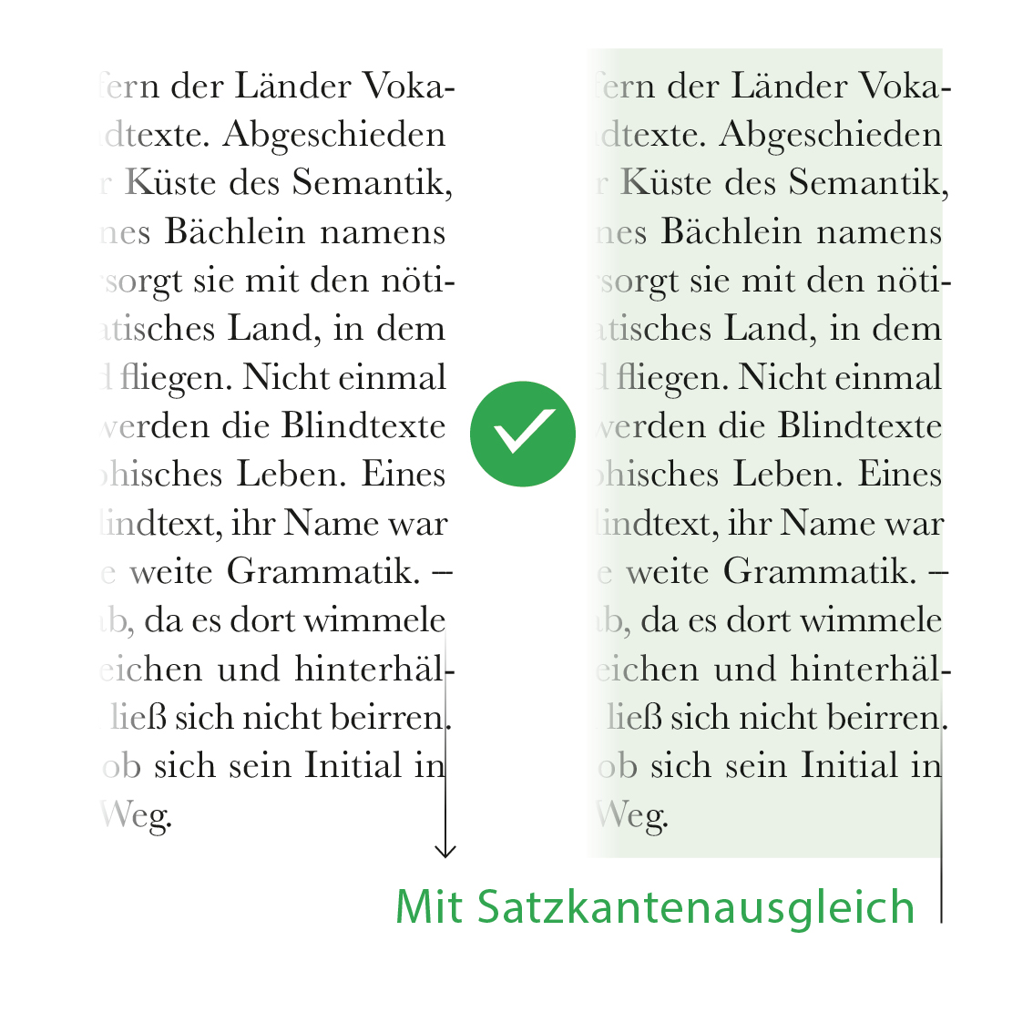 Durch die Trennstriche bei Worttrennungen und Gedankenstrichen entstehen hier kleine »optische Lücken«. Mit der Aktivierung des Satzkantenausgleiches in InDesign werden die Trenn- und Gedankenstriche etwas über die rechte Satzkante hinaus verlagert, um diese